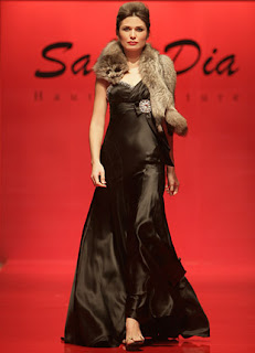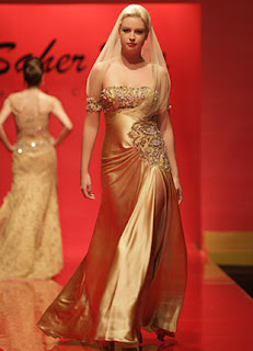 The bridal collection that followed was a mix of white lace, taffeta tulle and satin, embellished with crystals and accentuated by trailing veils delicately dusted with the precious stones. The collection, titled “Glamorous” made ample use of gold lamé as an under-layer for patterned tulle, adding to the allure and shimmer of the outfit.